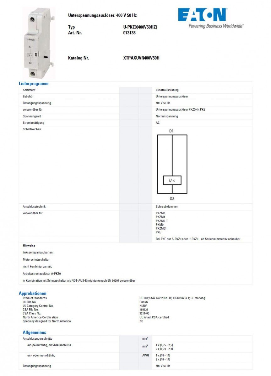 Eaton 073257 Unterspannungsausloser 400 V 50 Hz Amazon De